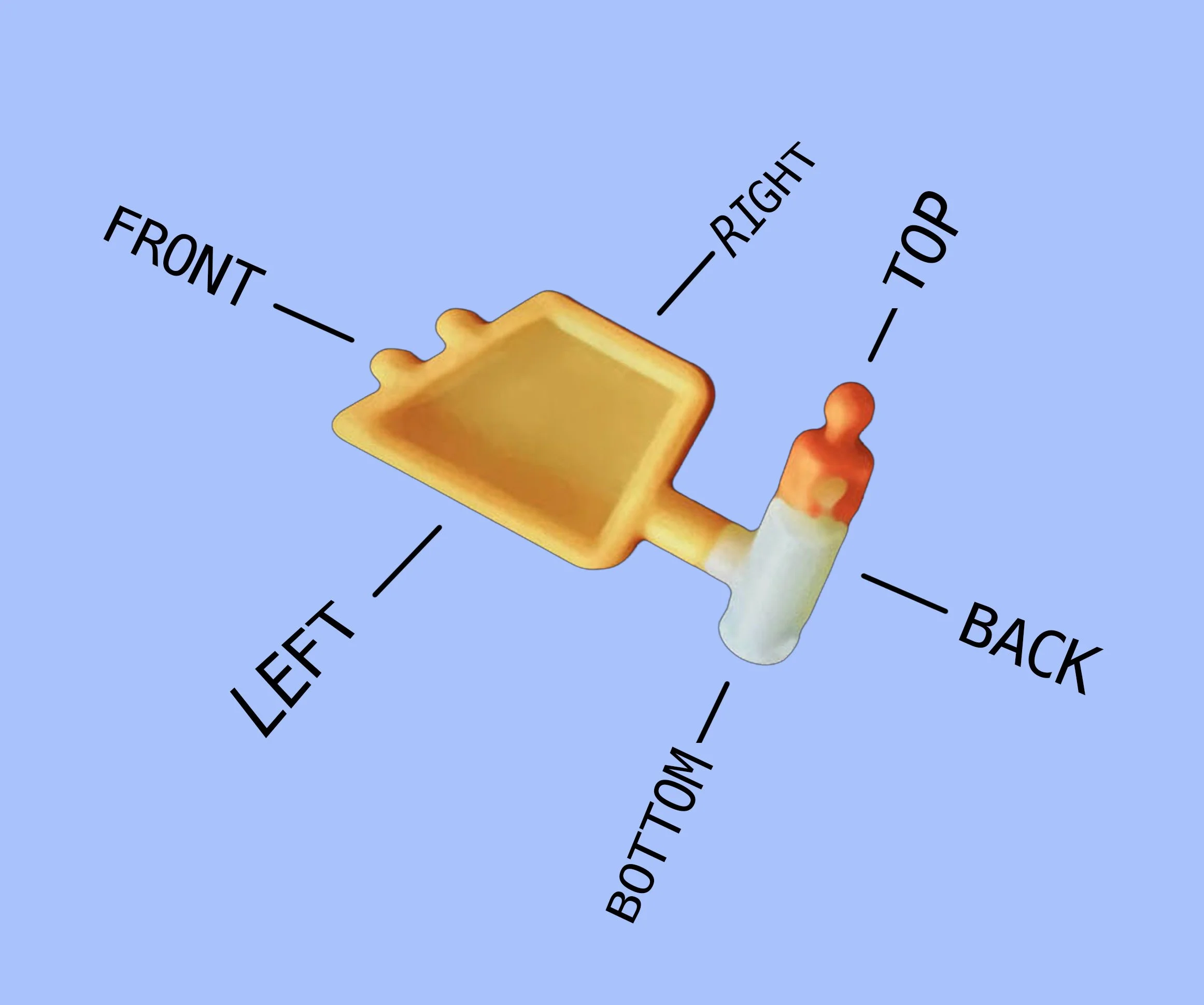 3. Looking down from above (at the phosphate at the ‘top,’) you can see that the base obviously has ‘right’ and ‘left’ sides. The two sides are quite different from each other. The PlayDNA! cartoon base has a long side and a short side - which is which depends on the type of base. In real DNA, the right and left sides are also quite different from each other, and this is extremely important.