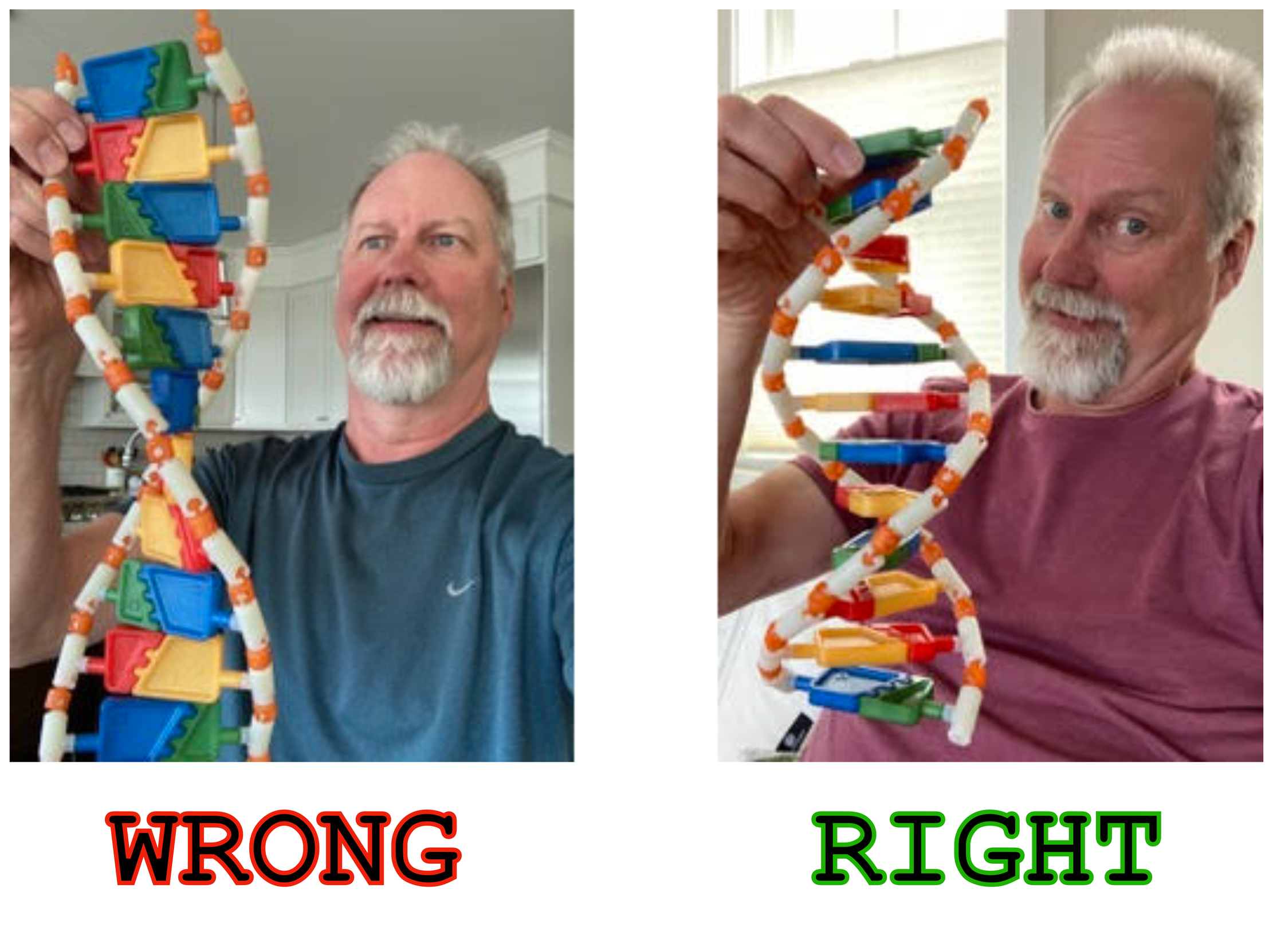 The PlayDNA! molecular modeling kit allows you to build a double helix in two different ways: the right way, and the wrong way. Without guidance, almost everybody does it the wrong way. And has a hard time imagining how any other way is possible!